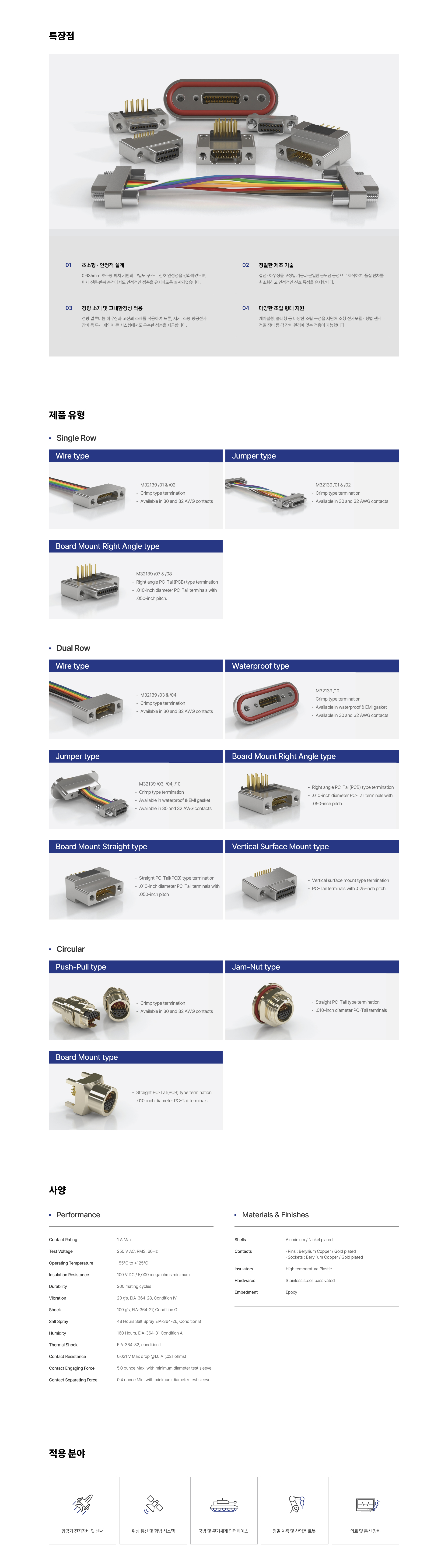 케이블형, 솔더형 등 다양한 조립 형태로 제공되며, 정밀 가공된 금도금 접점과 경량 하우징을 적용해 장기 사용 환경에서도 일관된 접촉 저항, 우수한 내구성, 신뢰 가능한 전기적 특성을 제공합니다.