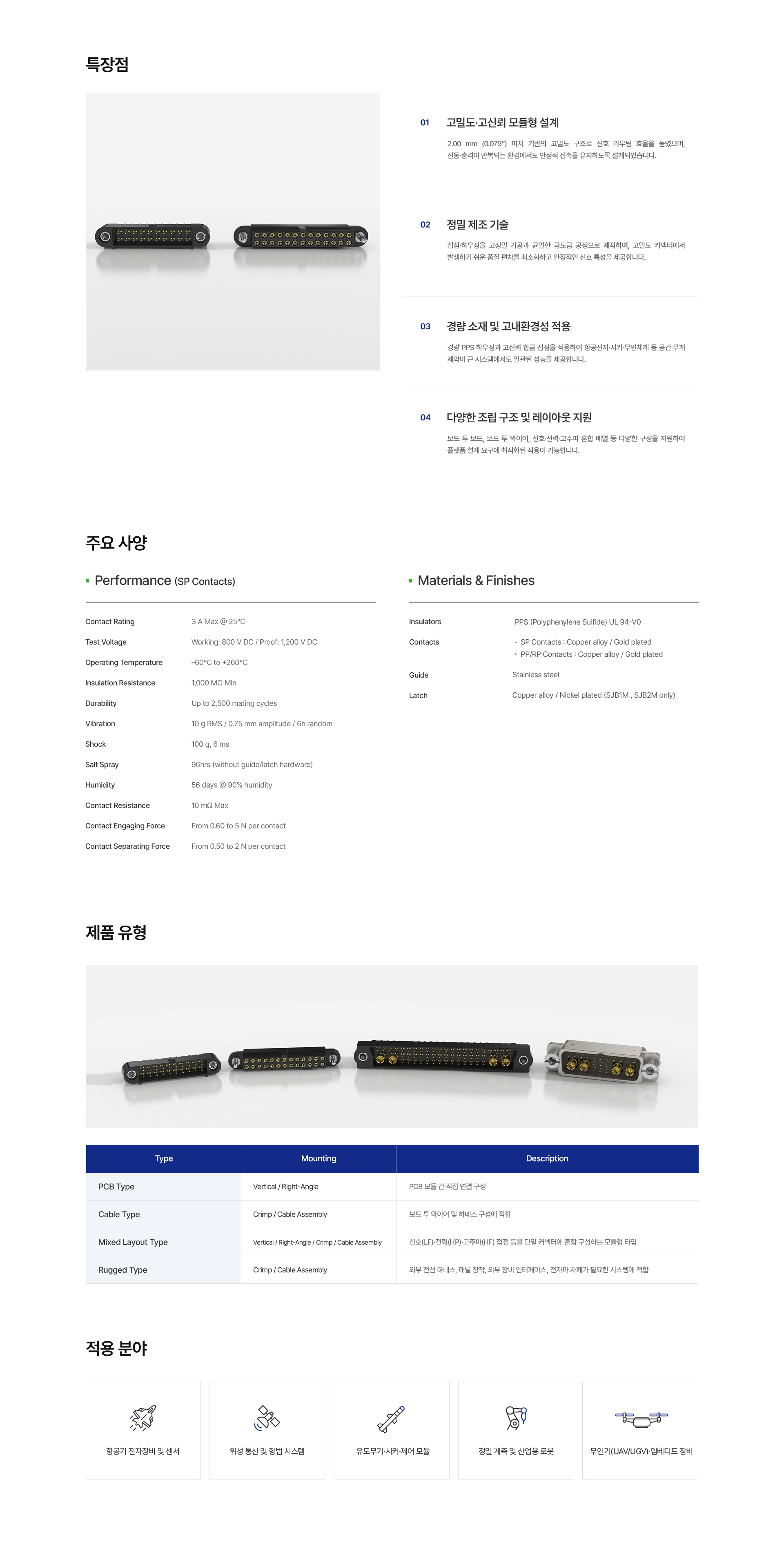 1열·2열·3열 기반의 다양한 배열을 제공하며, 정밀 가공된 금도금 접점과 경량 폴리머·금속 하우징을 적용해 장기 사용 환경에서도 일관된 접촉 저항과 우수한 내구성, 안정적인 전기적 특성을 제공합니다.